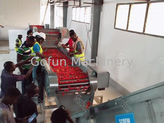 The system includes comprehensive screening and cleaning components, where a vibrating screen eliminates flawed tomatoes and impurities while a high-pressure bubble cleaning machine with brush rollers thoroughly cleanses surfaces by removing mud, pesticide residues, and unwanted particles. Flexible conveying mechanisms prevent damage to tomato skins, establishing a pristine base for processing.